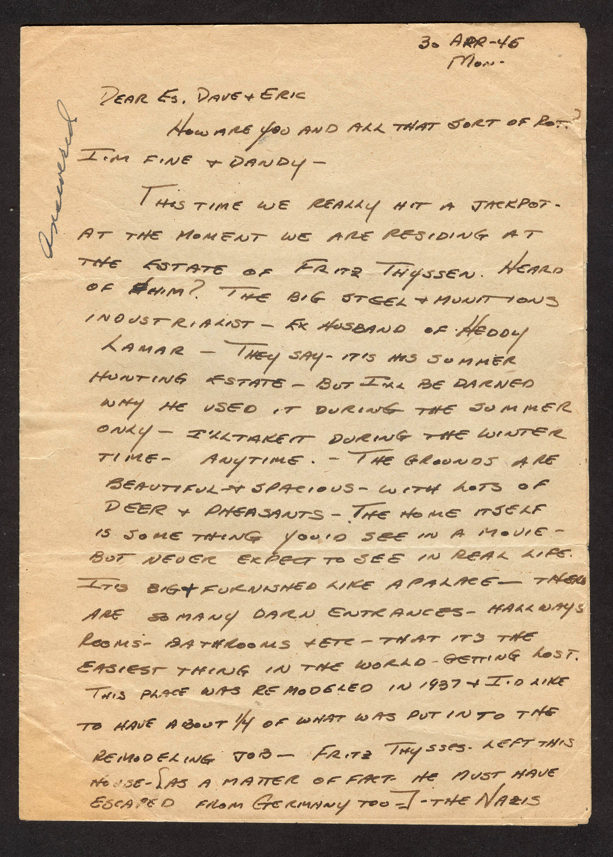 The Solly in this letter, as well as in future letters, knows and appreciates guns and writes Dave that he is boxing up and shipping him a Nazi bayonet and a 16 gauge shotgun.