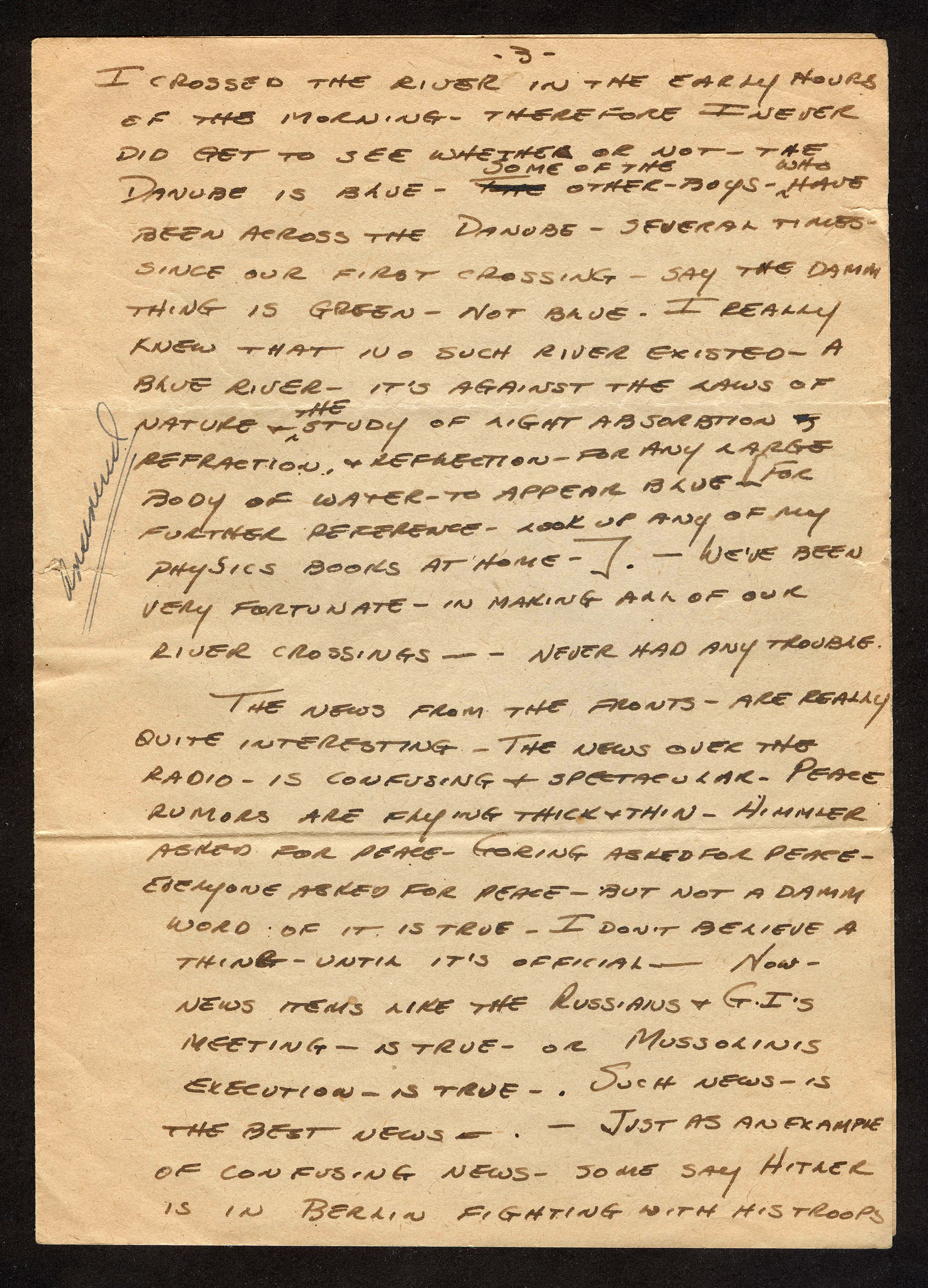 In this letter Solly also talks about his camera for the first time and having recently shot a roll of film but not sure what to do with it next. Censorship is a given and probably not something you think about when you are in combat and on the move, but now that they have a brief pause, or as Solly says they are “sitting on their fannies”, censorship must feel intrusive to him all over again.