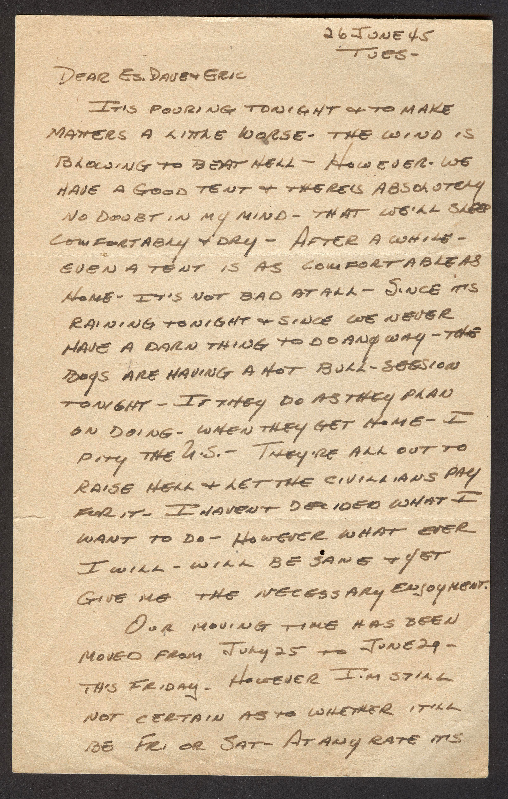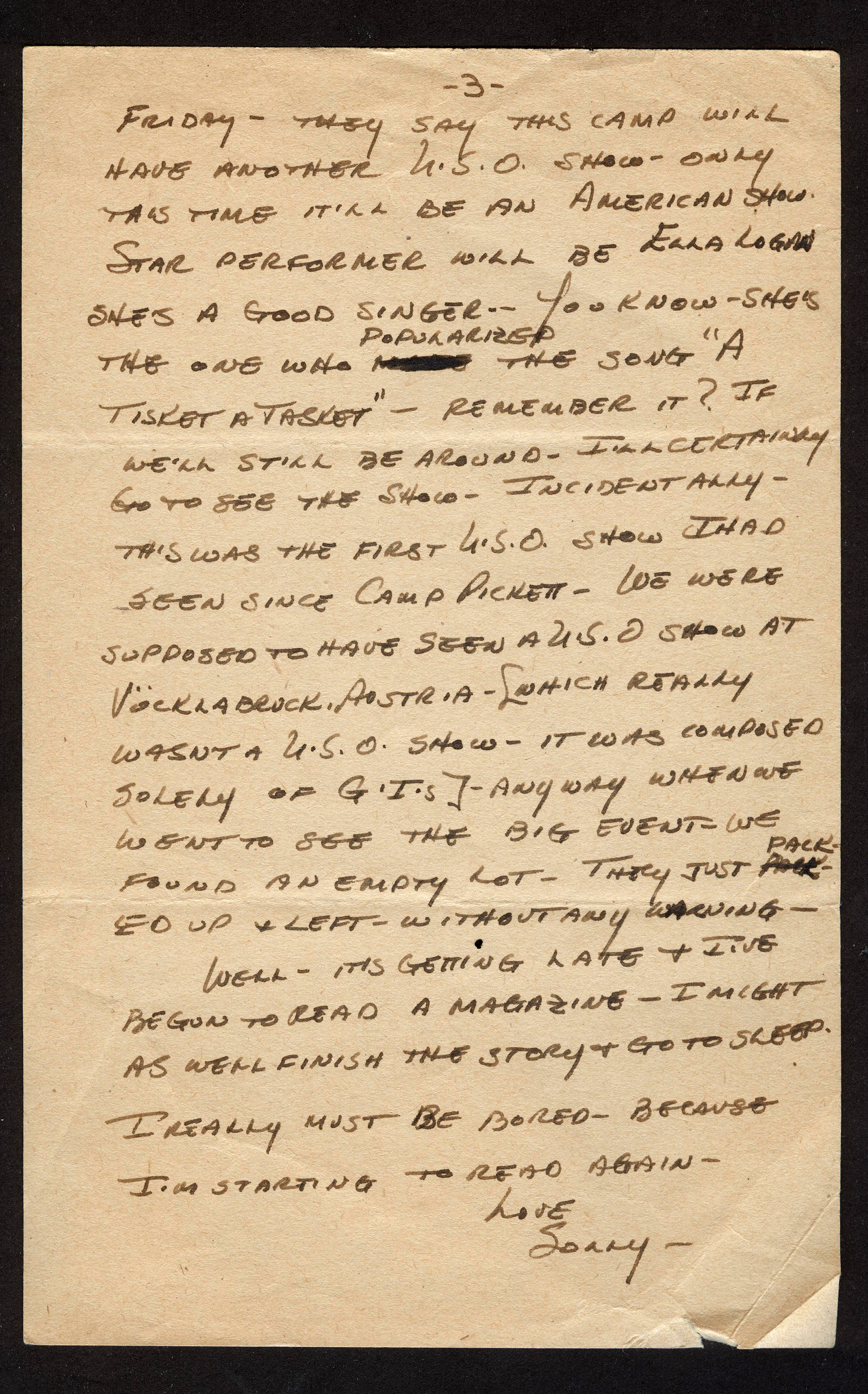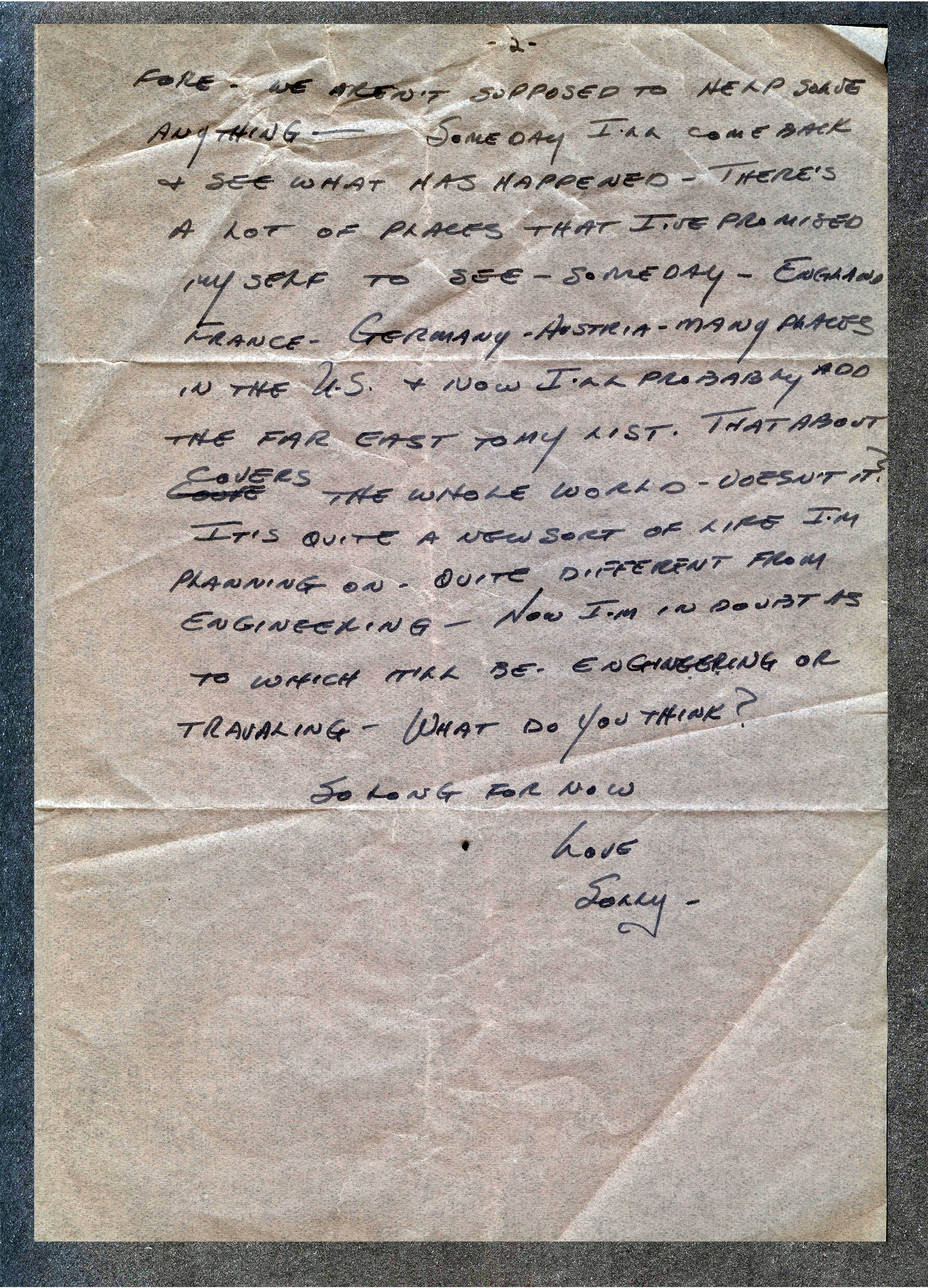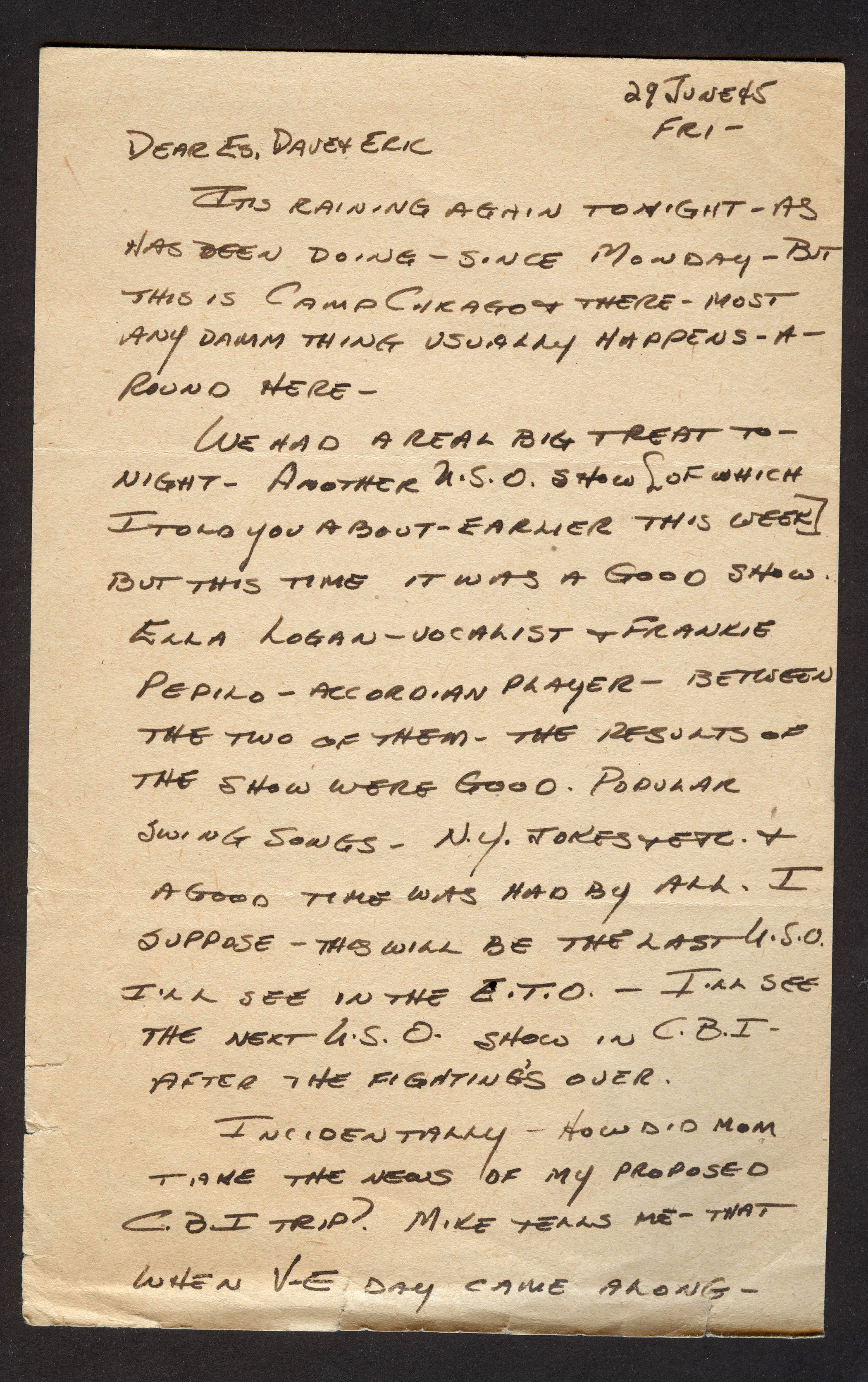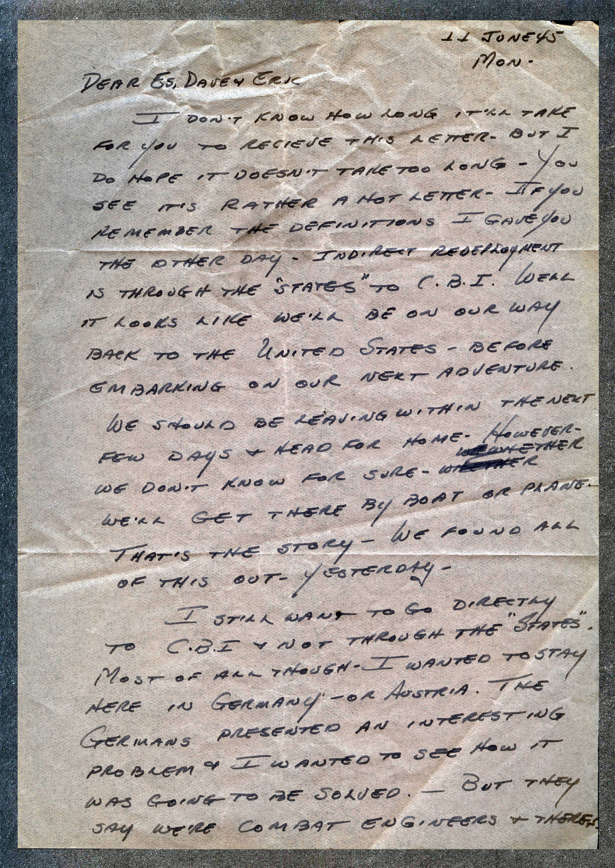 Solly enclosed these 5 photos with their notes on the reverse side in his June 9, 1945 letter to Esther, Dave and Eric. Handwritten on the back of some of these photos is the same message Solly writes in a number of his other letters: don’t tell mom.