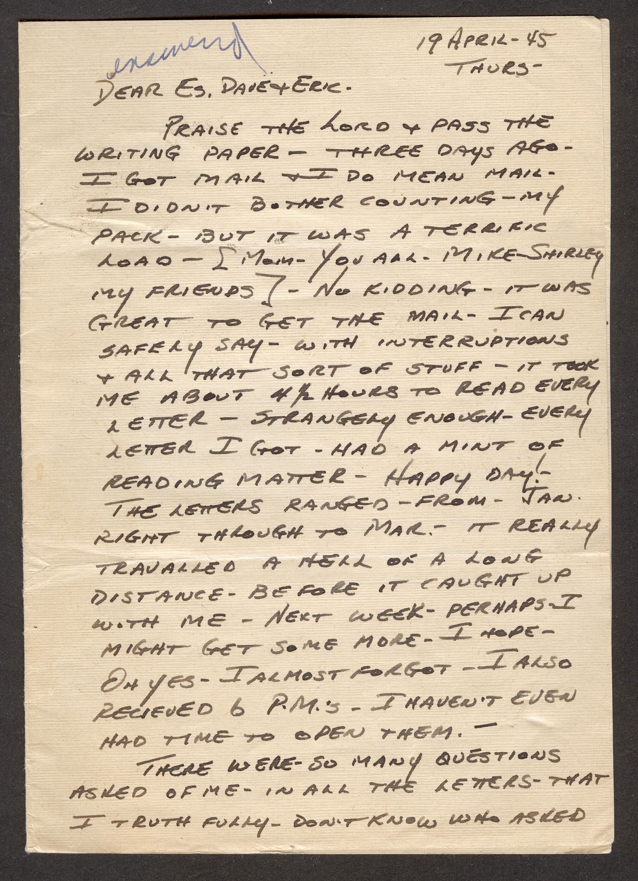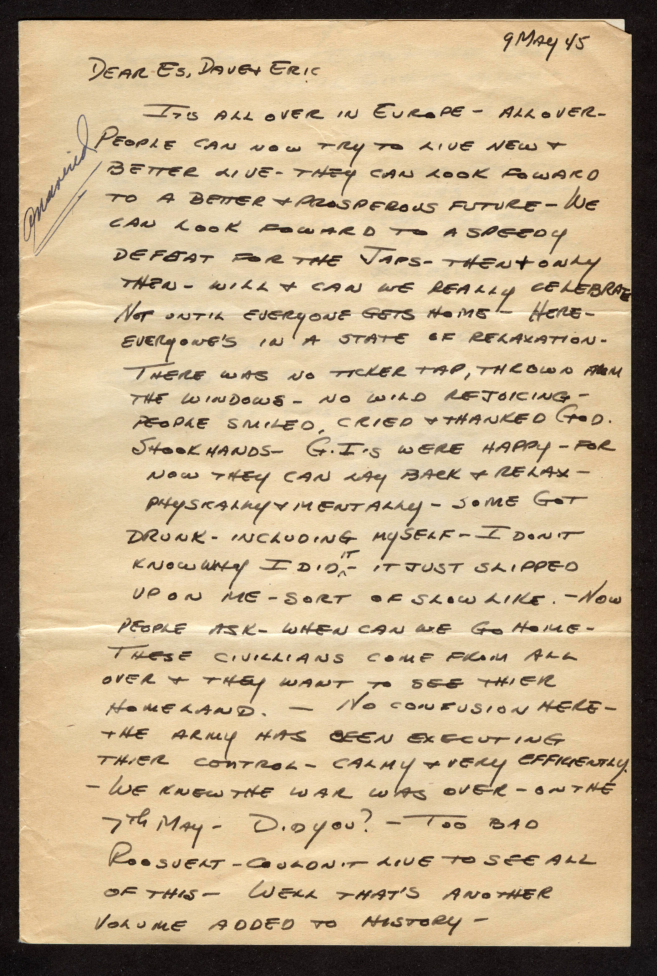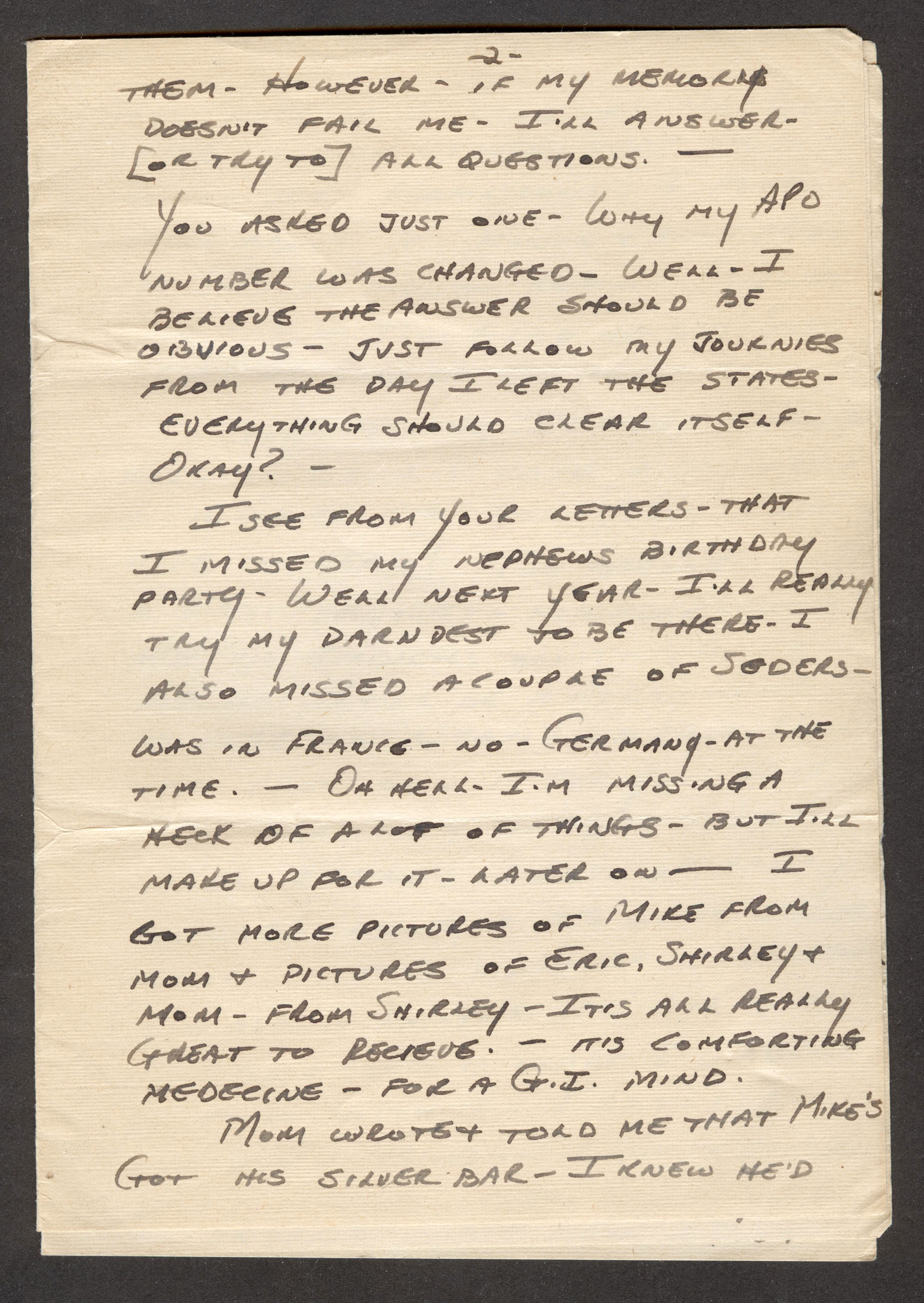 In this letter Solly also talks about his camera for the first time and having recently shot a roll of film but not sure what to do with it next. Censorship is a given and probably not something you think about when you are in combat and on the move, but now that they have a brief pause, or as Solly says they are “sitting on their fannies”, censorship must feel intrusive to him all over again.