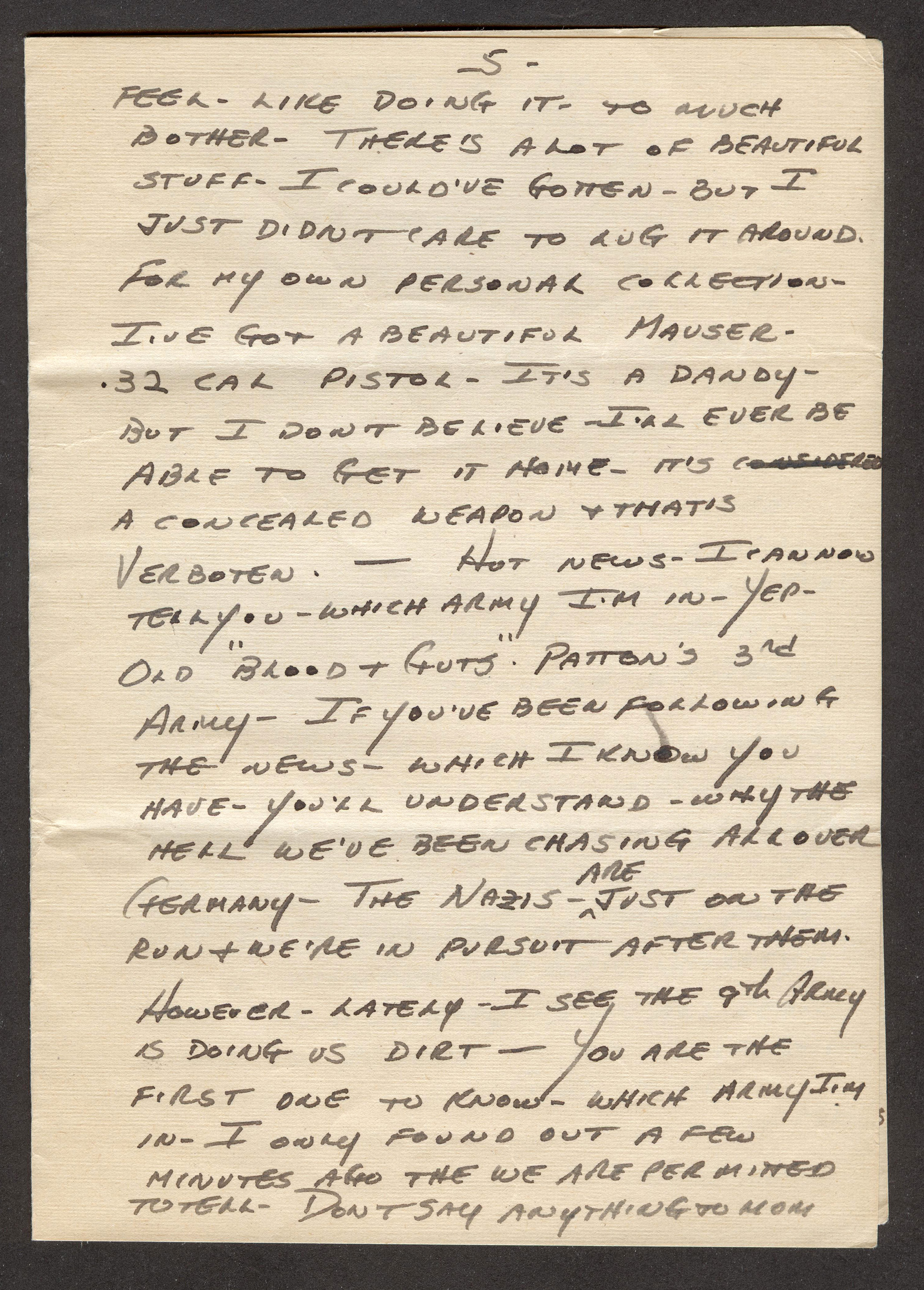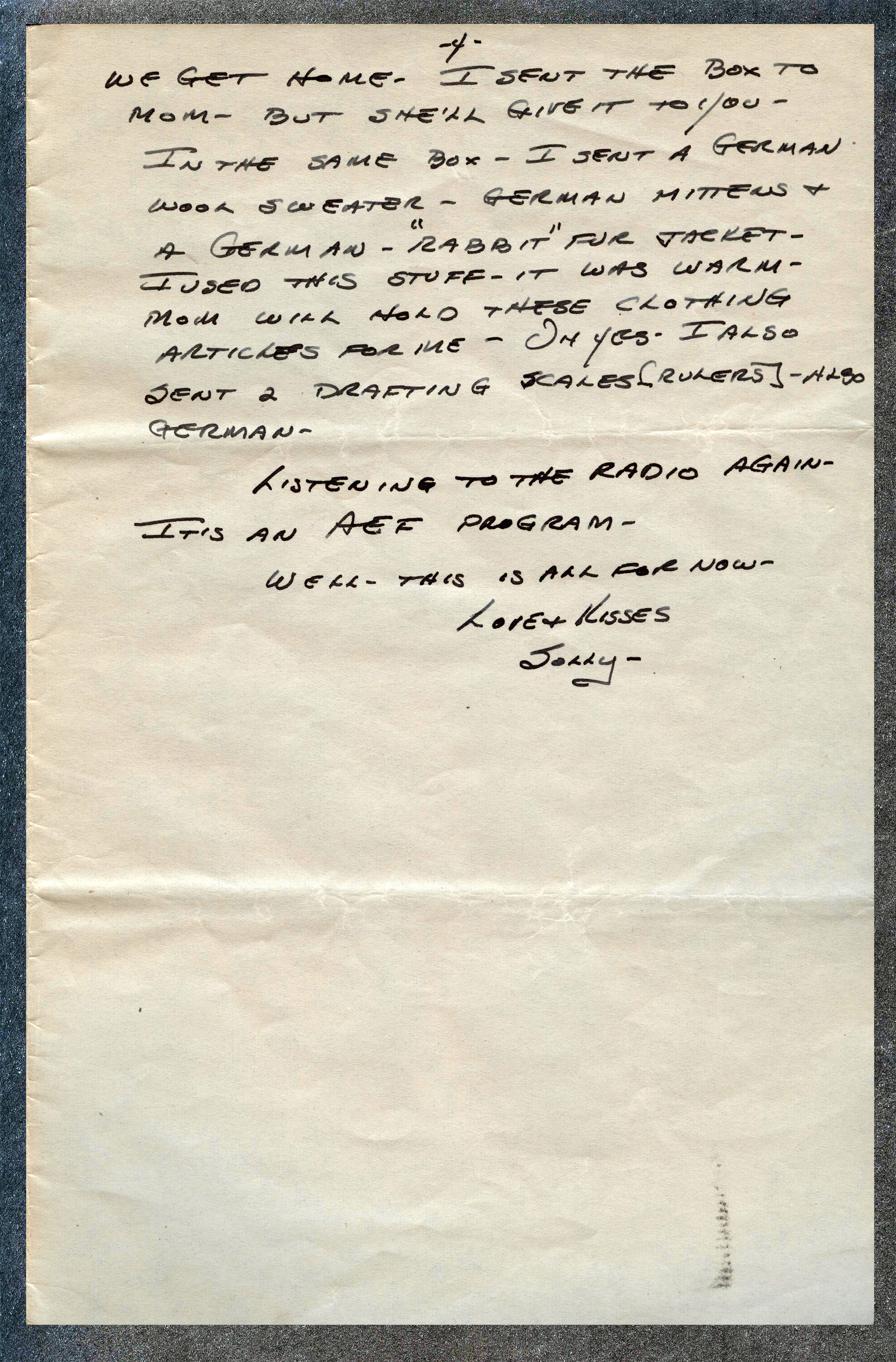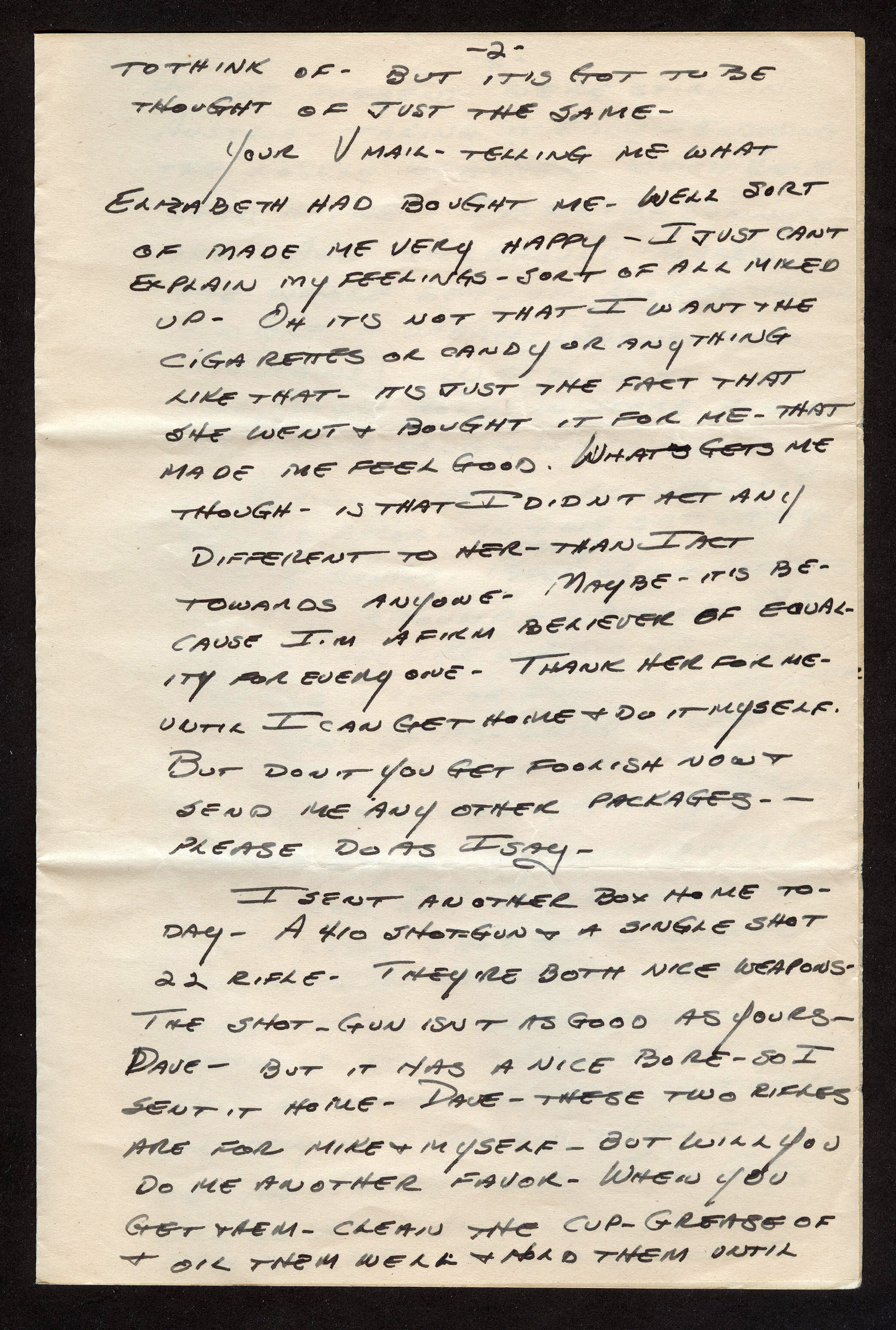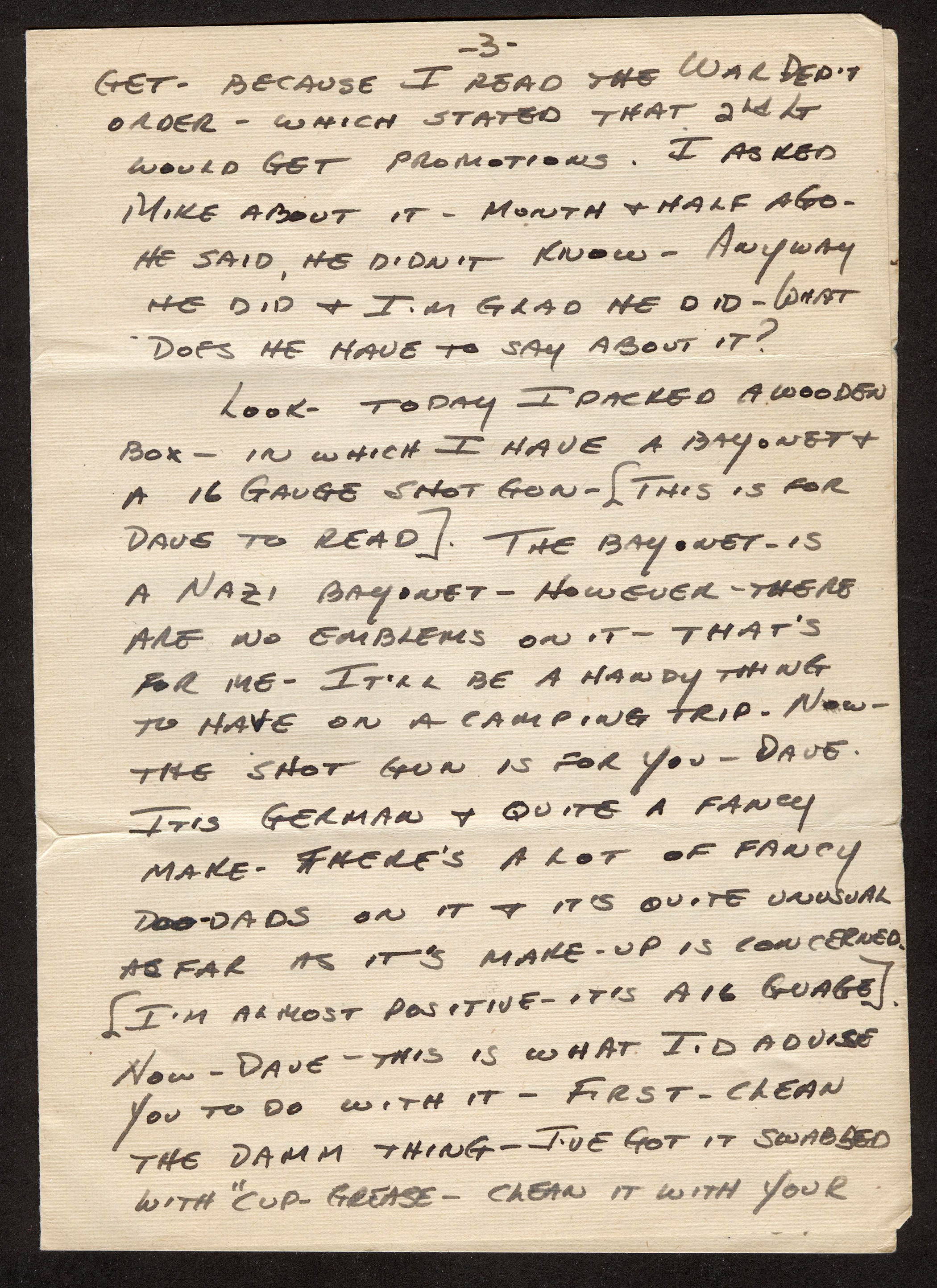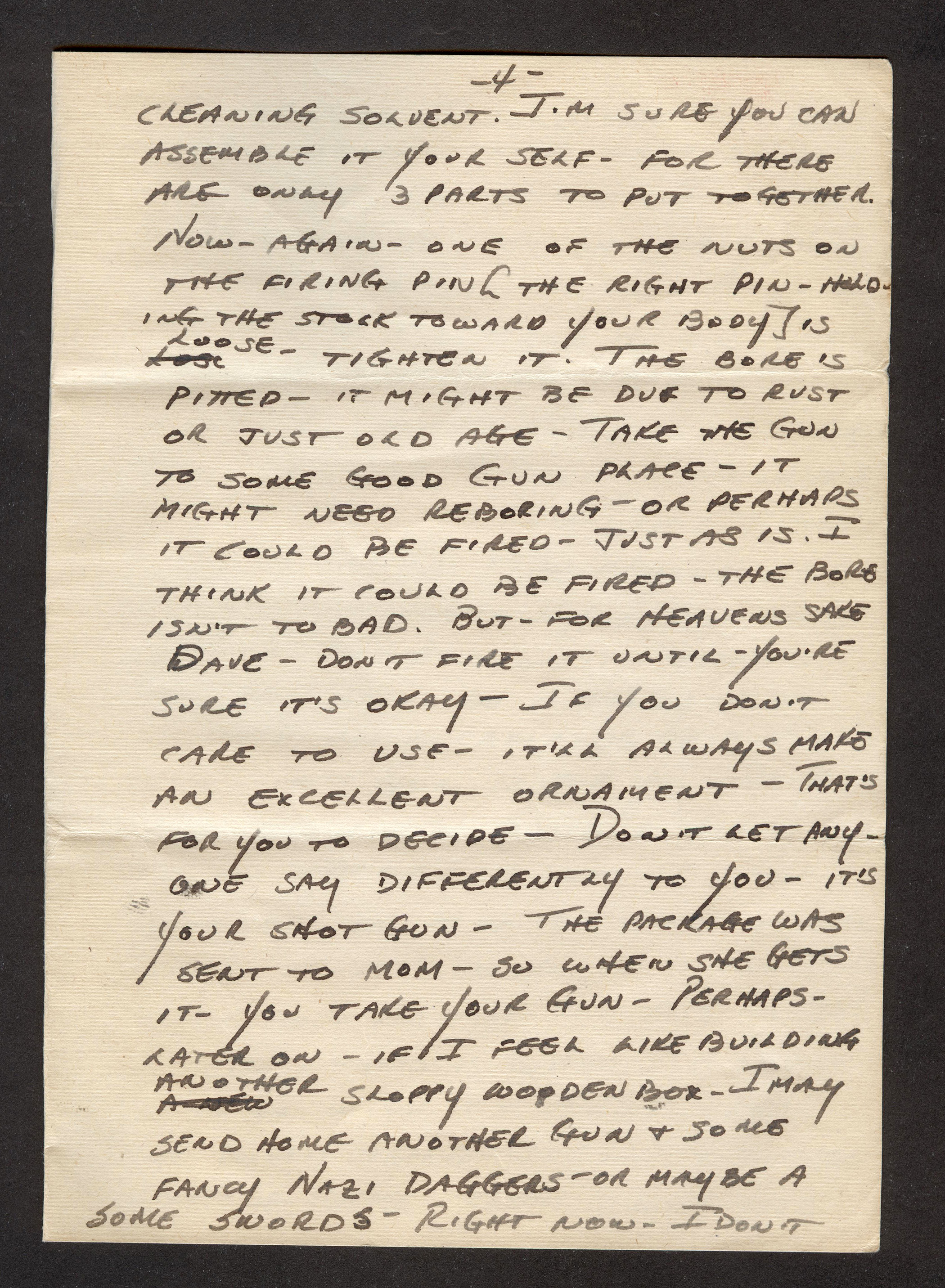 The Solly in this letter, as well as in future letters, knows and appreciates guns and writes Dave that he is boxing up and shipping him a Nazi bayonet and a 16 gauge shotgun.