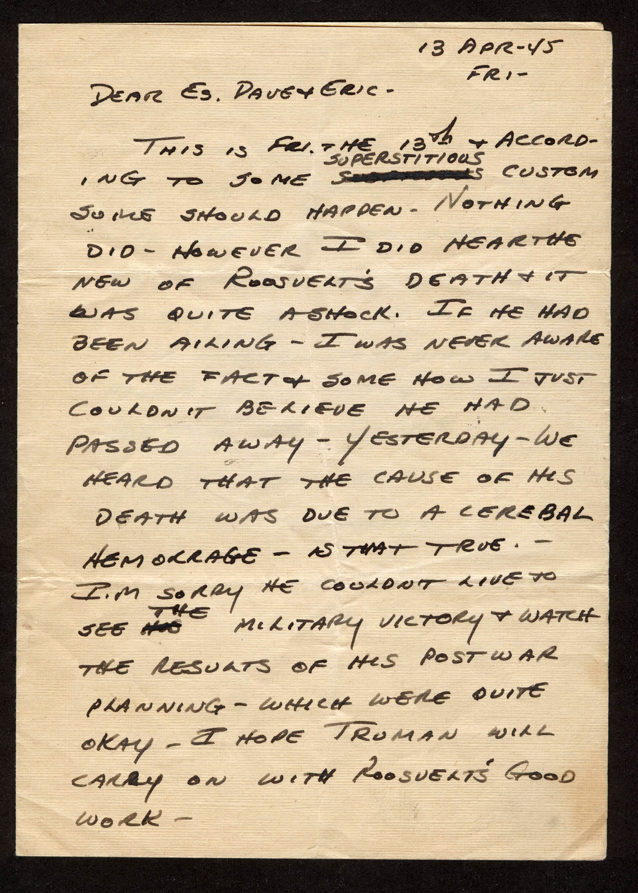 #27 – April 13, 1945 On view: 2 pages and one reverse side image of p. 2 with handwritten notes by Esther April 13, 1945, p.1 p. 2 Reverse side of p. 2 with handwritten notes by Esther